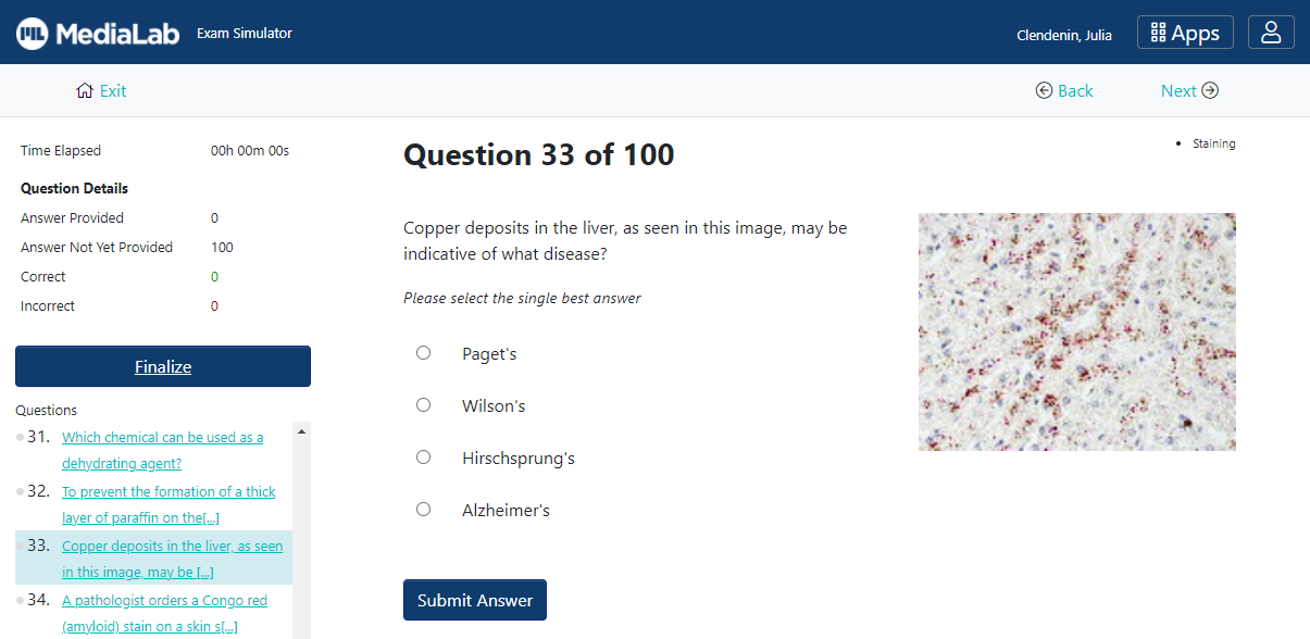 Important: LabCE, MediaLab, and NSH do not warrant or guarantee that you will pass your ASCP exam as a result of using this exam simulator system. This exam simulator is not an exact copy of the ASCP exam. Questions presented in this exam simulator may differ substantially from those you may see on the actual examination. The actual exam may cover material that is not covered by LabCE and MediaLab. Adequate preparation for HT/HTL exams should include a variety of resources from many different providers. The Histology Exam Simulator is not officially endorsed or supported by ASCP or any organization other than LabCE, MediaLab, or NSH.